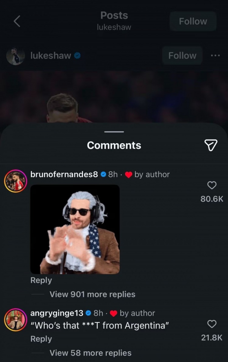 曼联球迷对卢克·肖的互动反响热烈。当博主Angry Ginge评论道“那个来自阿根廷的混蛋是谁?”时,卢克·肖通过点亮红心点赞明确表达了自己的态度。